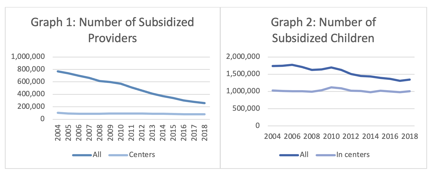 The immediate result is that the majority of small home-based providers, faced with increasing obstacles to dealing with the expanding bureaucratic requirements, have exited the subsidy system. Between 2006 and 2018, over 70% fewer home-based providers nationwide received CCDF subsidies. The exodus caused a significant decrease in the total number of subsidized providers. The number of subsidized children also dropped by 24 percent during this time. Those children continuing to receive subsidies are more likely to be placed in formal care than in the previous era.