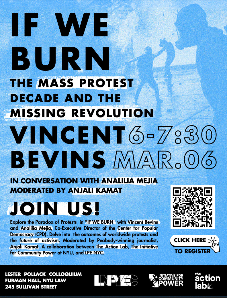 Explore the Paradox of Protests in Vincent Bevins most recent book, If We Burn: The Mass Protest Decade and the Missing Revolution with the author and Analilia Mejia, Co-Executive Director of the Center for Popular Democracy (CPD). Delve into the outcomes of worldwide protests and the future of activism. Moderated by Peabody-winning journalist, Anjali Kamat.