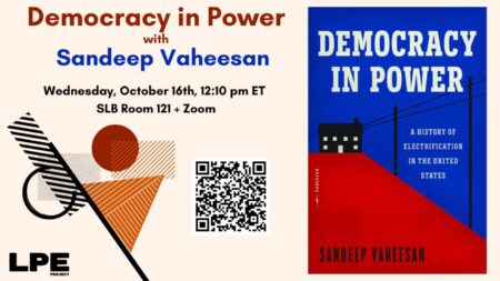 The LPE Project hosted a lunch talk with Sandeep Vaheesan, the legal director at the Open Markets Institute, on October 16th. The discussion focused on his forthcoming book (December 2024) Democracy in Power: A History of Electrification in the United States (The University of Chicago Press). Democracy in Power explores how private financial interests controlled…
