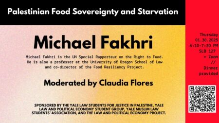 We warmly invite you to join a conversation with Professor Michael Fakhri, the UN Special Rapporteur on the Right to Food, on Palestinian food sovereignty and starvation. This event will take place on Thursday, January 30, from 6:10 to 7:30 PM ET. Professor Claudia Flores (Yale Law School) will moderate the discussion. Dinner will be…