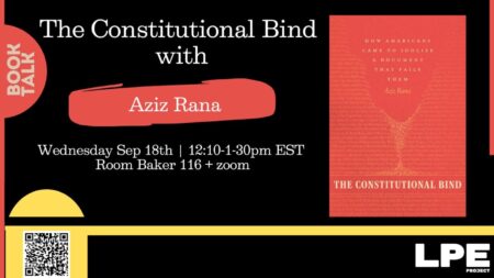 The LPE Project hosted a lunch talk with Professor Aziz Rana, the J. Donald Monan, S.J., University Professor of Law and Government at Boston College Law School, on Wednesday, September 18th, to discuss his latest book, The Constitutional Bind (The University of Chicago Press, 2024). The Constitutional Bind investigates the history of the American Constitution…