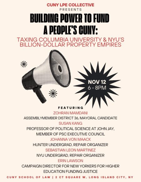 Please join CUNY Law’s LPE Collective as we speak to a panel featuring Assemblymember and mayoral candidate Zohran Mamdani and members of the REPAIR NY coalition who are organizing to achieve a fully funded People’s CUNY by taxing Columbia and NYU’s billion-dollar property empires. This event will take place on Tuesday, November 12, from 6pm…