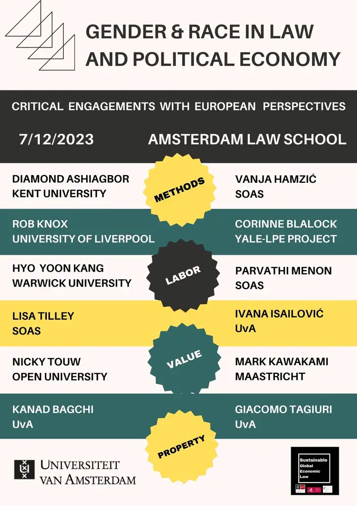 The Sustainable Global Economic Law (SGEL) center at the University of Amsterdam is holding an interdisciplinary event on December 7th (9am CET/ 8am GMT) to explore how gender and race relate to law and political economy in comparative transnational contexts, centering on European perspectives and legacies. Speakers will address this overarching theme in connection to three key overlapping legal notions that structure the economy: value, labor and property, from a variety of interdisciplinary perspectives.
