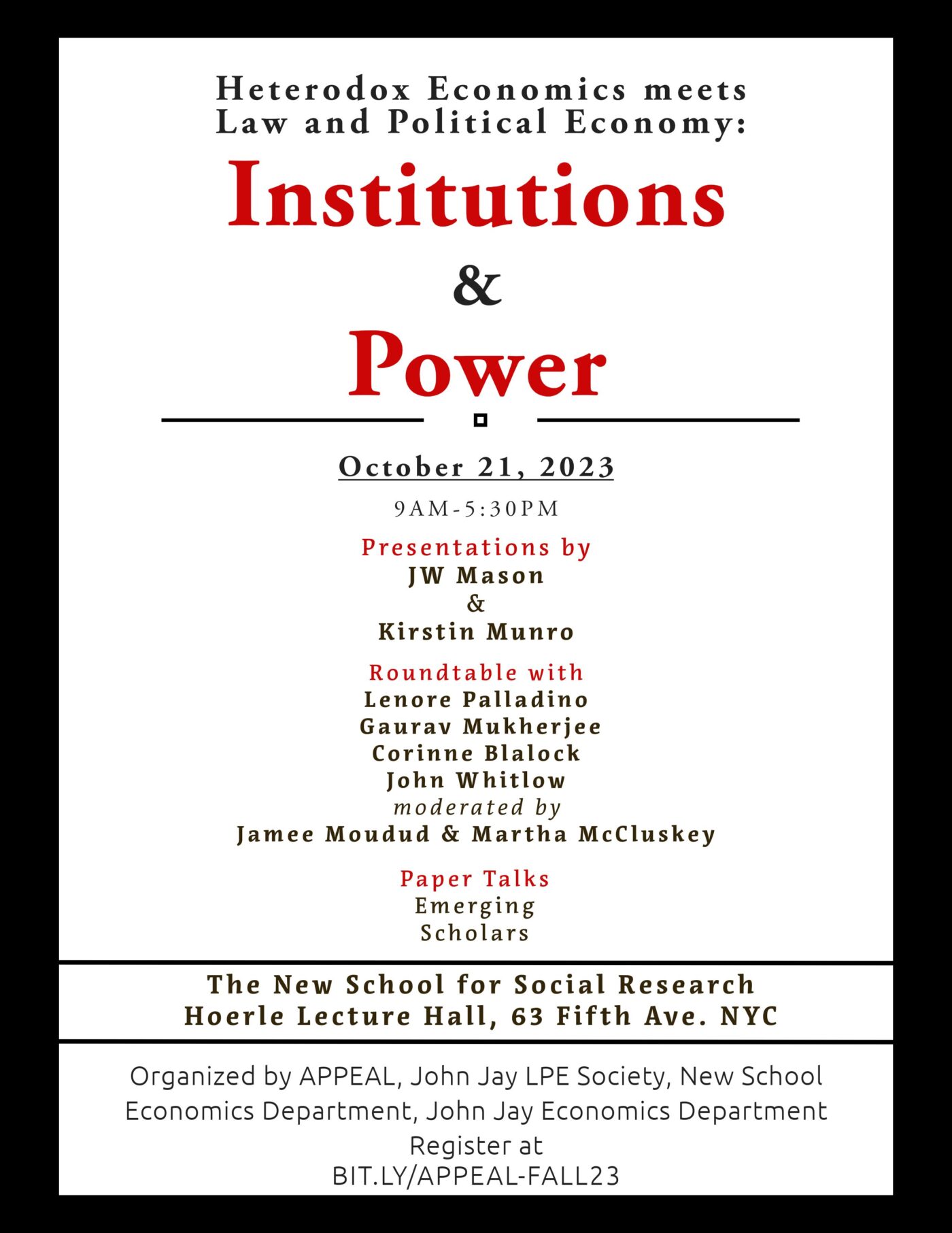 The Association for the Promotion of Political Economy and the Law (APPEAL), John Jay College Economics Department, John Jay College Law and Political Economy Society, and the Economics Department at the New School. The gathering will be held October 21st at The New School (6 East 16th Street, New York, NY). If you would like to attend, please register HERE by October 12th.