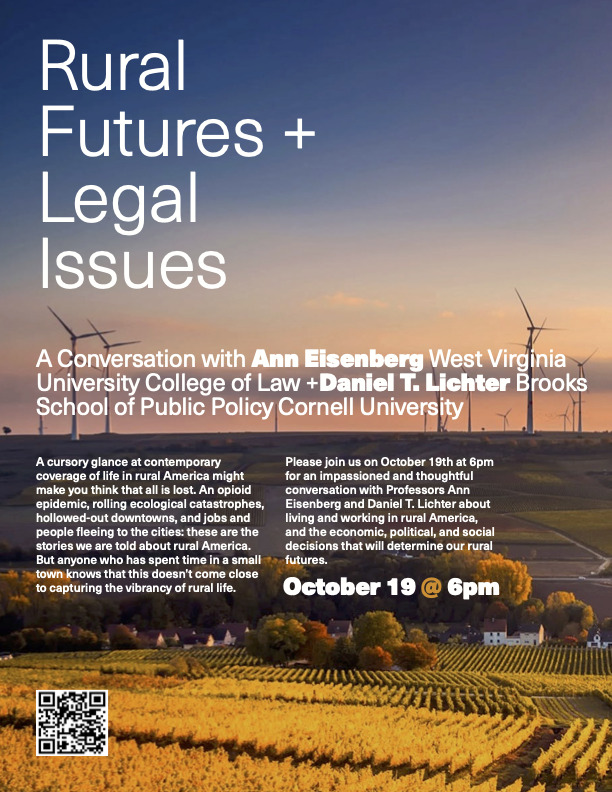 Please join The Cornell Law and Political Economy Collective on October 19th at 6pm for an impassioned and thoughtful conversation with Ann Eisenberg and Daniel T. Lichter about living & working in rural America, and the economic, political, and social decisions that will determine our rural futures.