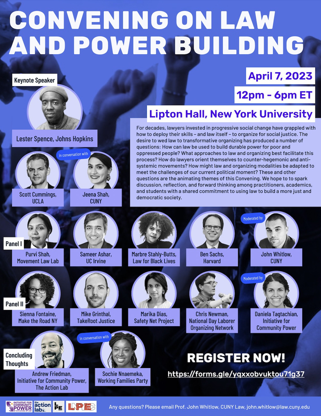 These and other questions are the animating themes of the Convening on Law and Power Building. The Convening is intended to spark discussion and reflection – as well as forward and strategic thinking – among practitioners, academics, and students with a shared commitment to using law to build a more just and democratic society. Speakers will include Lester Spence (Johns Hopkins), Purvi Shah (Movement Law Lab), Ben Sachs (Harvard), Sameer Ashar (UC Irvine), Scott Cummings (UCLA), Marbre Stahly-Butts (Law for Black Lives), Chris Newman (National Day Laborer Organizing Network), Marika Dias (Safety Net Project), Mike Grinthal (TakeRoot Justice), Sienna Fontaine (Make the Road NY), Jeena Shah (CUNY), Andrew Friedman (NYU/Action Lab), Sochie Nnaemeka (Working Families Party), Daniela Tagtachian (Initiative for Community Power), and John Whitlow (CUNY).