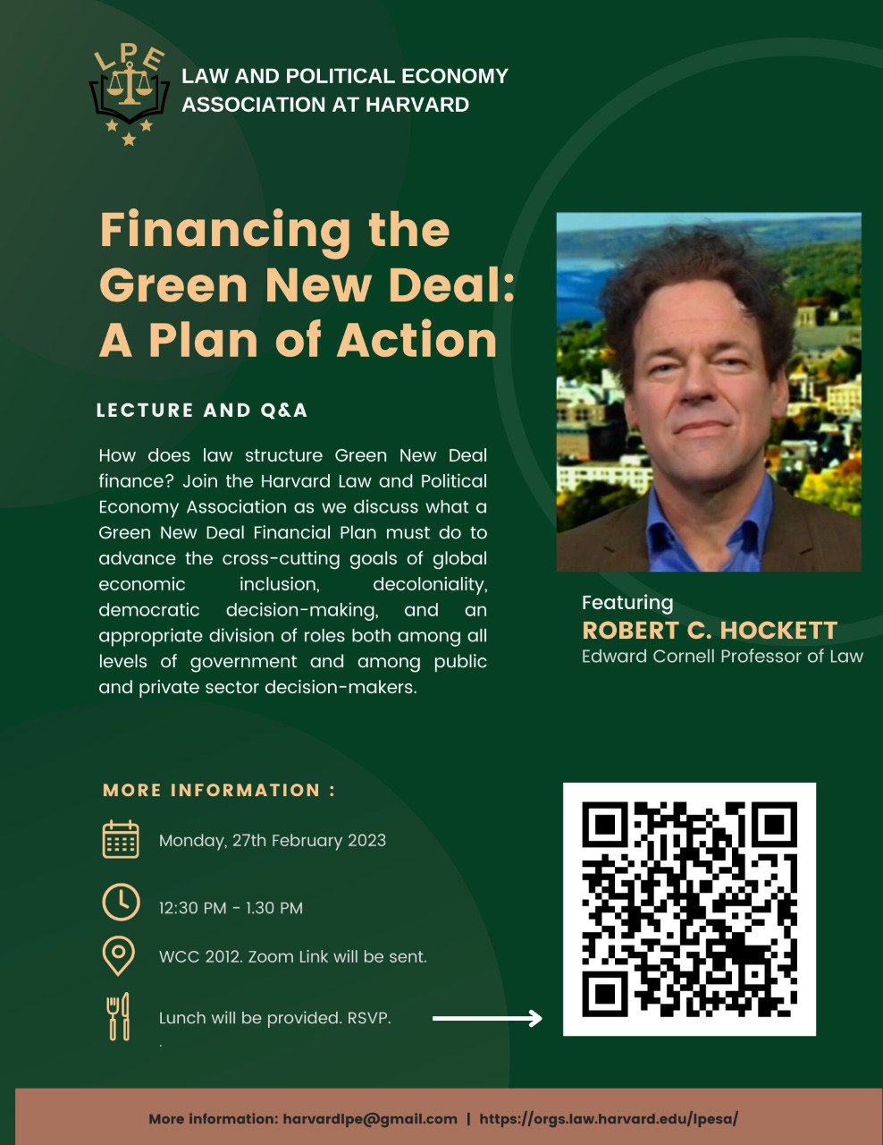 Please join the Harvard LPE Association for a lecture and Q&A with Robert C. Hockett, Edward Cornell Professor of Law. The Harvard LPE Association will meet at WCC 2012, and on Zoom from 12:30 – 1:30 pm ET on Monday, February 27th. Lunch will be provided!