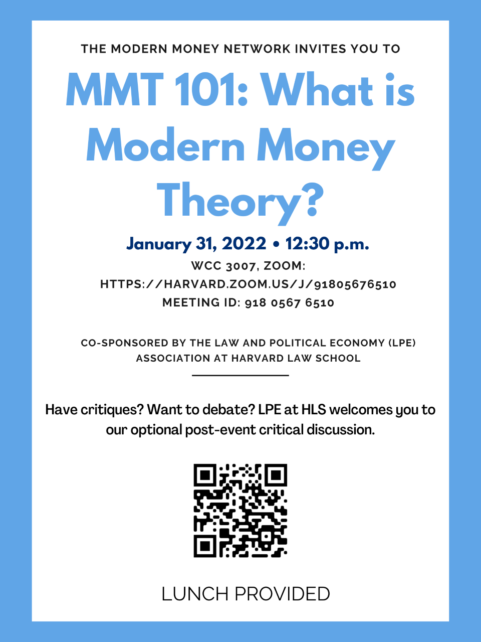 Please join the Harvard LPE Association and the Modern Money Network (MMN) for an introduction to MMT with Hannah Judson, the Executive Director of MMN. We will meet at Wasserstein Hall Room 3007, and on Zoom from 12:30 – 1:30 pm ET.