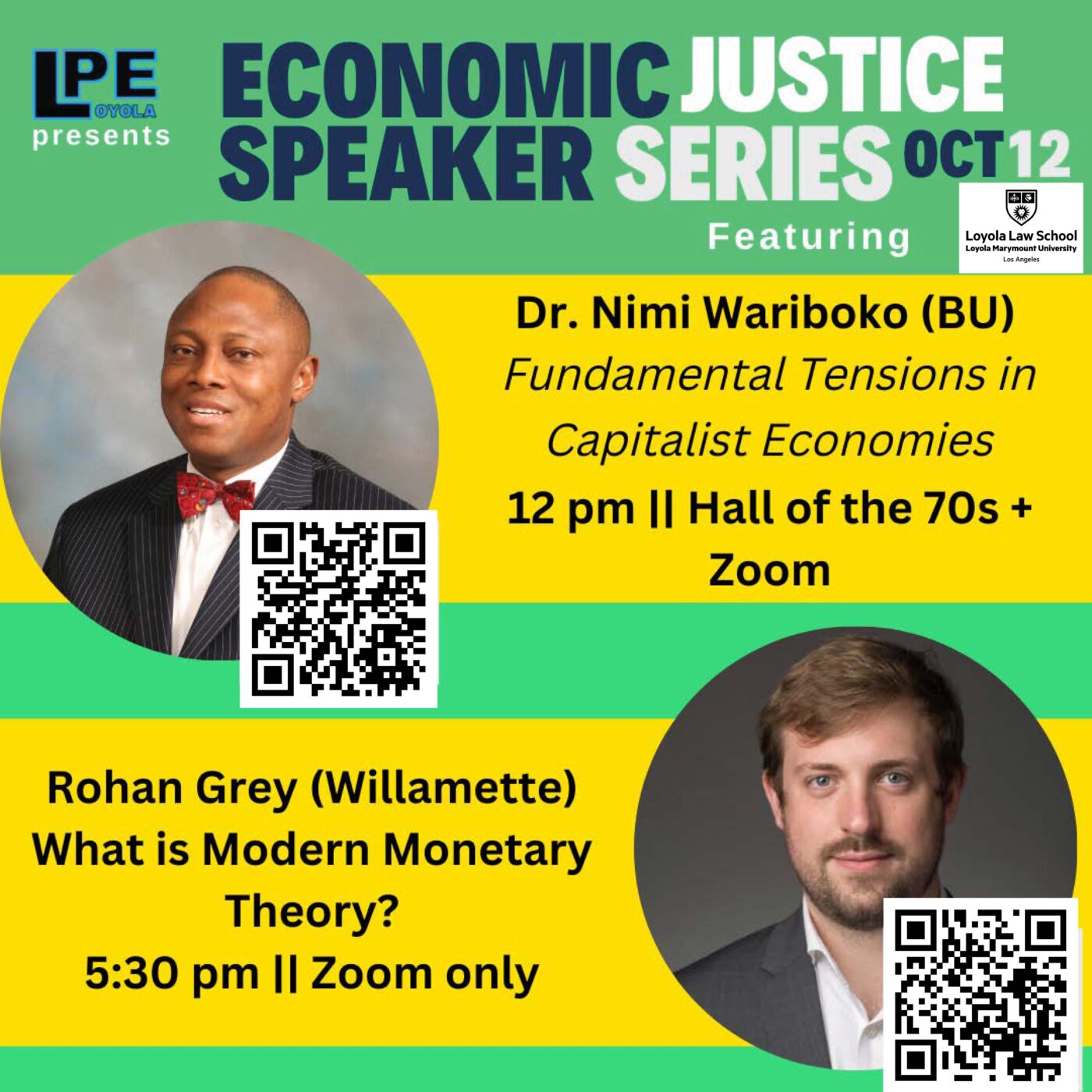 Please join LPE Loyola for a double header featuring talks by interdisciplinary political philosopher Dr. Nimi Wariboko (Walter G. Muelder Professor of Social Ethics at Boston University) and MMT policy expert Rohan Grey (Assistant Professor of Law, Willamette University).