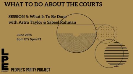 The final session of our 6-part open course/reading group “What To Do About The Courts,” cohosted with the People’s Parity Project, took place on June 25th at 8pm ET/ 5pm PT, led by Astra Taylor and Sabeel Rahman. TOPIC: The courts have been a galvanizing issue on the Right in recent decades, but not so…