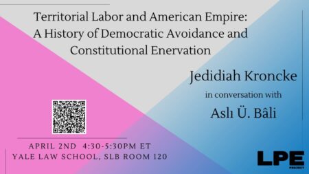 Please join the LPE Project on Tuesday, April 2nd, at 4:30pm ET (please note time change!) for a talk with Professor Jedidiah Kroncke, on “Territorial Labor and American Empire: A History of Democratic Avoidance and Constitutional Enervation.” Much recent attention has been given to acknowledging the full historical scope of the American empire and its…