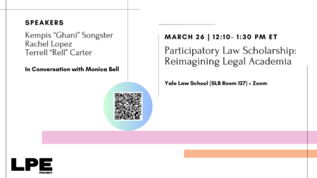 The LPE Project and YLS LPE Student Group hosted a lunch talk with Terrell “Rell” Carter, Rachel Lopez, and Kempis “Ghani” Songster, on Participatory Law Scholarship: Reimagining Legal Academia on Tuesday, March 26th. Carter, Lopez, and Songster have authored the groundbreaking articles “Redeeming Justice” and “Regarding the Other Death Penalty,” among other works. Most recently,…