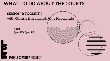 The fourth session of our 6-part open course/reading group “What To Do About The Courts,” cohosted with the People’s Parity Project, took place on April 16 at 8pm ET/ 5pm PT, be led by Professors Ganesh Sitaraman and Amy Kapczynski. TOPIC: Several reforms have been proposed to restructure, reform, and/or disempower the courts, each with different stakes and addressing…