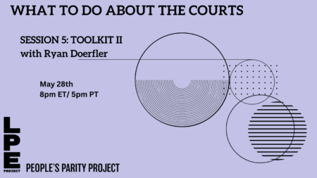 The fifth session of our 6-part open course/reading group “What To Do About The Courts,” cohosted with the People’s Parity Project, took place on May 28th at 8pm ET/ 5pm PT, led by Professor Ryan Doerfler. TOPIC: Several reforms have been proposed to restructure, reform, and/or disempower the courts, each with different stakes and addressing different problems with the…