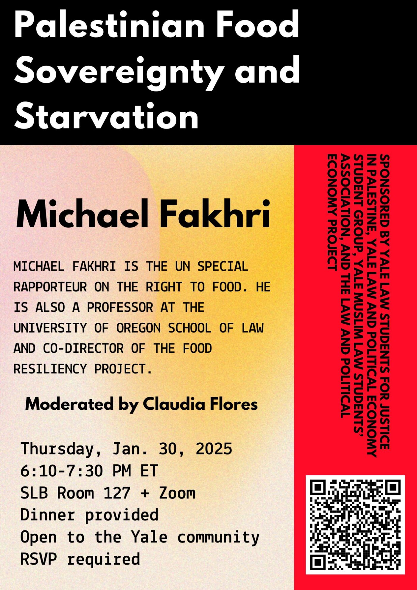 We warmly invite you to join a conversation with Professor Michael Fakhri, the UN Special Rapporteur on the Right to Food, on Palestinian food sovereignty and starvation. This event will take place on Thursday, January 30, from 6:10 to 7:30 PM ET. Professor Claudia Flores (Yale Law School) will moderate the discussion. Dinner will be provided.