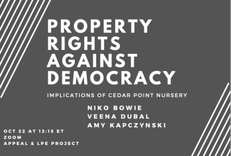 Please join the LPE Project and The Association for the Promotion of Political Economy & the Law (APPEAL) for our informal LPE “Office Hours.” When: Friday Nov. 12, 2021, 4:00 PM -5:00 PM Eastern Time (UTC-5) via Zoom (link will be provided to accepted registrants) Registration & Deadline: Sign up here by 12:00 PM ET on Wed.…
