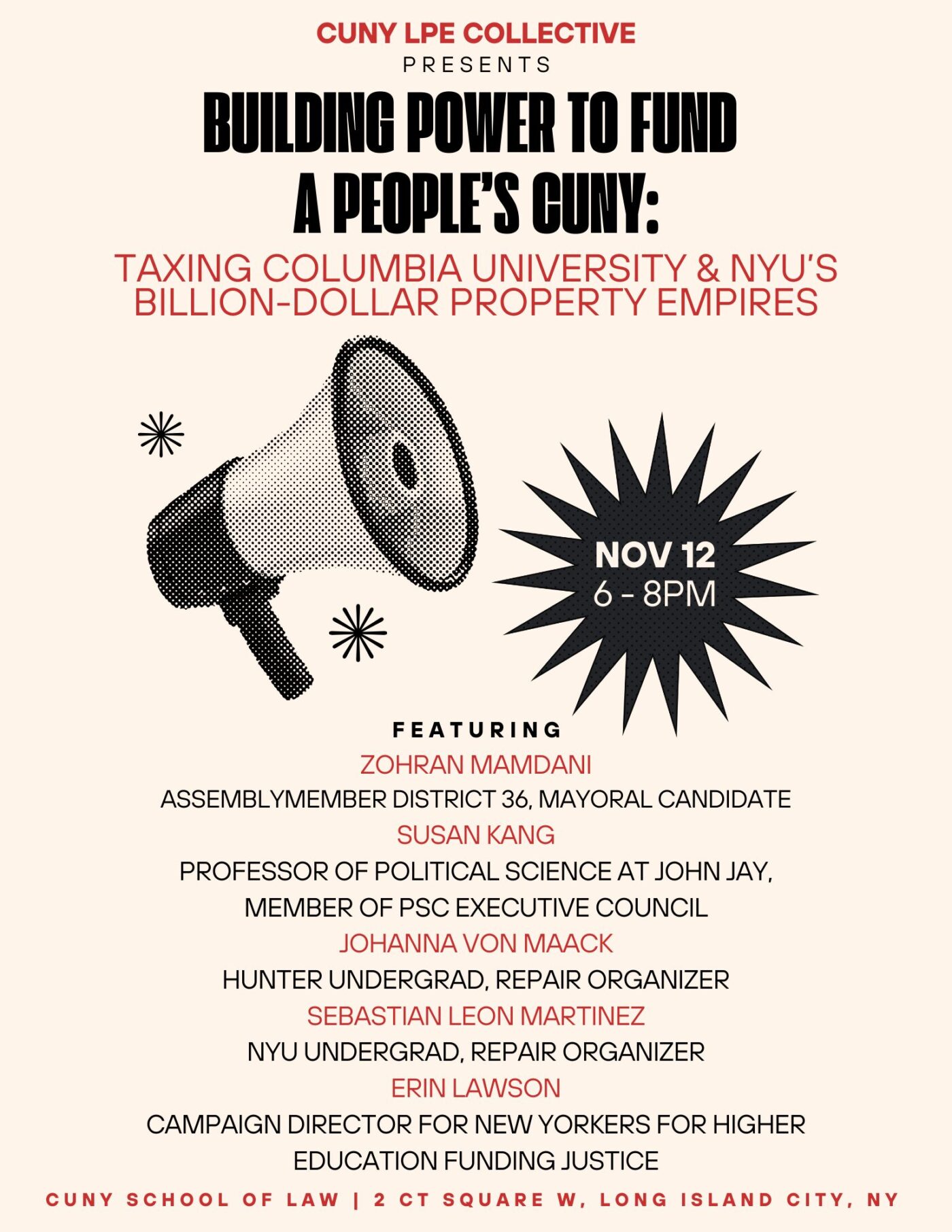 Please join CUNY Law’s LPE Collective as we speak to a panel featuring Assemblymember and mayoral candidate Zohran Mamdani and members of the REPAIR NY coalition who are organizing to achieve a fully funded People’s CUNY by taxing Columbia and NYU’s billion-dollar property empires.
