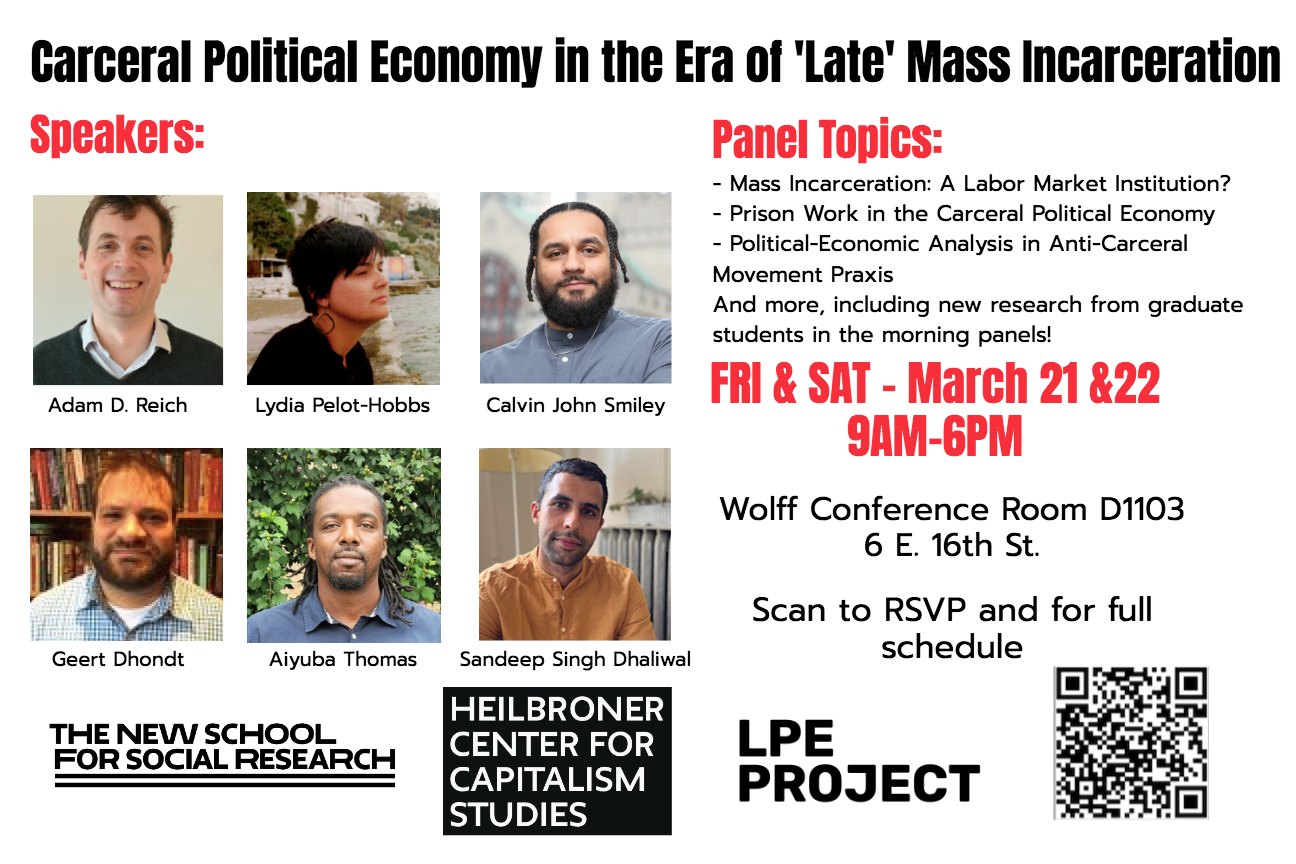 The LPE Project is thrilled to be co-sponsoring, “Carceral Political Economy in the Era of Late Mass Incarceration” at the New School for Social Research, March 21-22, with The Robert L. Heilbroner Center for Capitalism Studies.