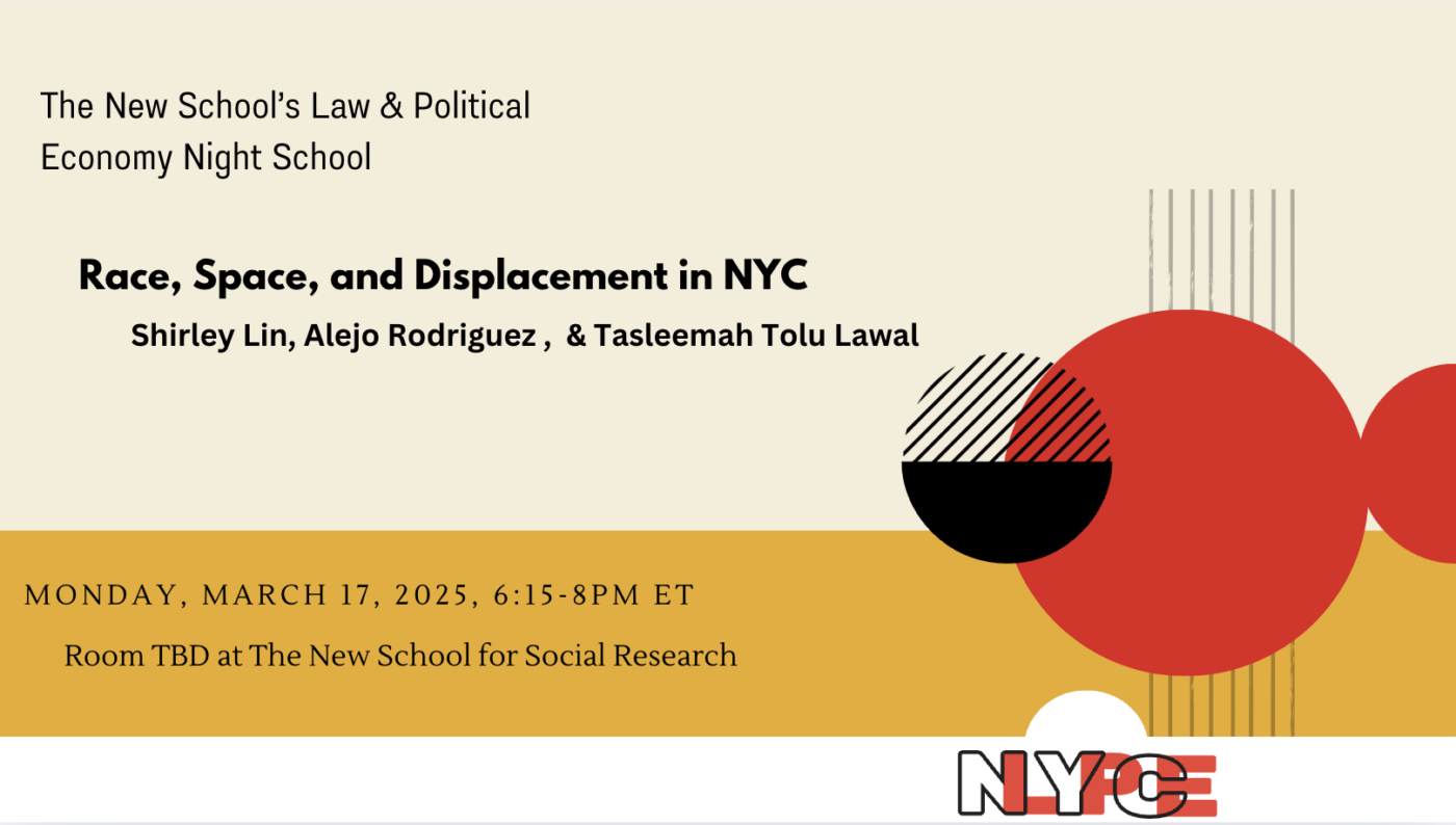 The next session of the LPE Night School “Race, Space, and Displacement in NYC” will take place March 17 at 6:15pm at the New School. In a conversation facilitated by Tasleemah Tolu Lawal (NYU Center on Race, Inequality, and the Law), Alejo Rodriguez (Columbia Law/ BATTLE) and Shirley Lin (Brooklyn Law School) will discuss how institutions exploit race and immigration status as part of a divide-and-conquer strategy against movements in New York. They will begin their conversation by discussing the political economy of the ongoing migration crisis as a launch point for interrogating the state’s use of bureaucracies of force. Registration is required.