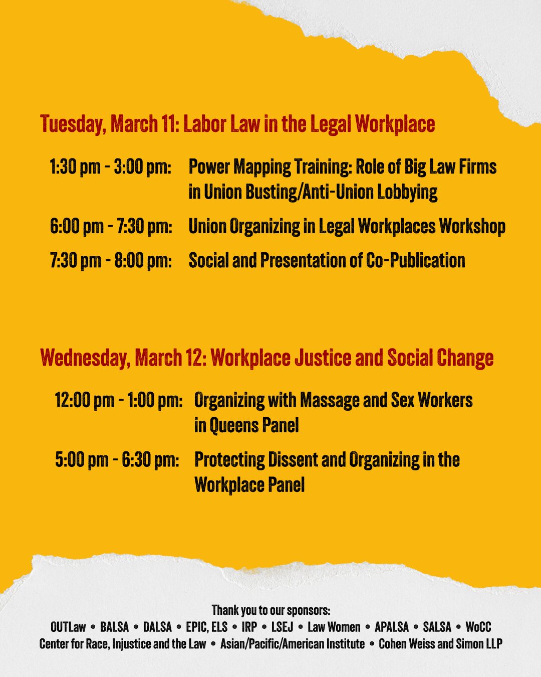 - 5:00 PM – 6:30 PM: Protecting Dissent and Organizing in the Workplace Panel